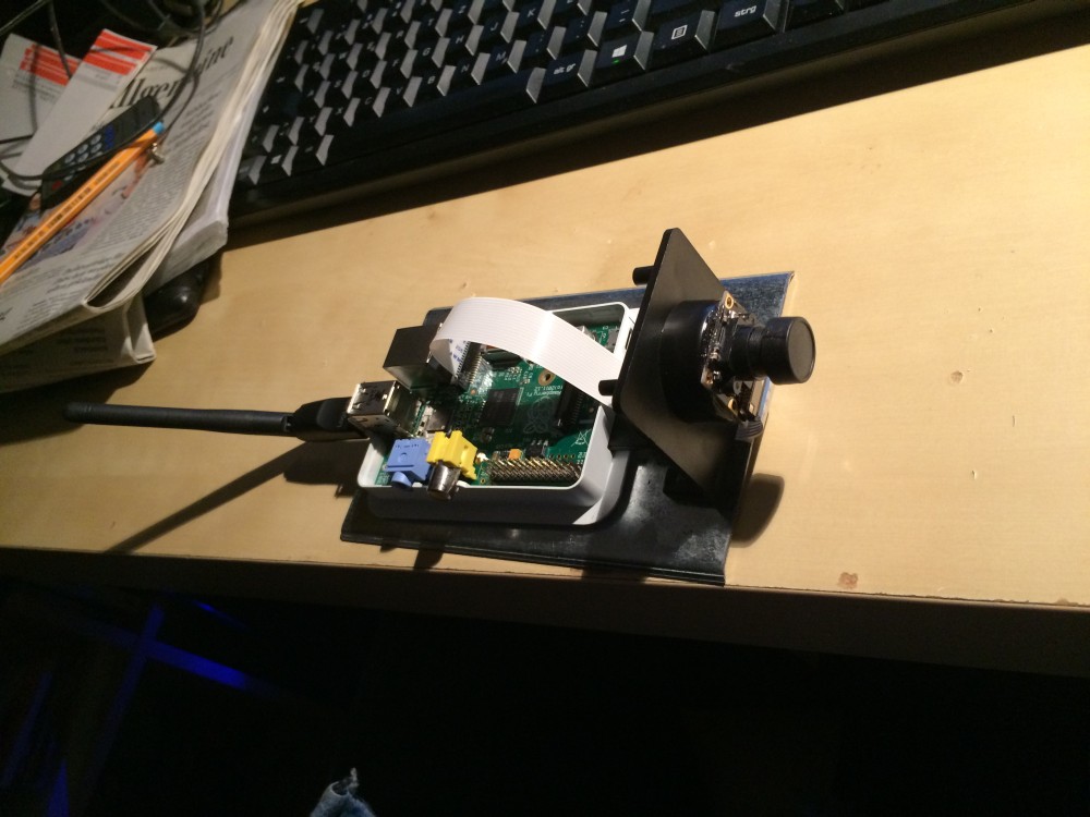 Für die Webcam kommt die Raspberry Pi Camera v2.1 in Verbindung mit einem Raspberry Pi Model B zum Einsatz. Es besitzt eine Auflösung von maximal 8 MP, bildet im 4:3-Verhätlnis ab und hat ein Vollformat-Brennweitenäquivalent von ca. 29 mm. Im manuellen Belichtungsmodus können maximal 10.0 s Belichtungszeit und ISO 800 gewählt werden. Untergebracht ist die Kamera in einem Außengehäuse einer günstigen Überwachsungskameraatrappe, wie sie bei Ebay, Amazon etc. erhältlich sind. Zwar hält diese nicht 100% dicht, da aber die Raspberry-Platine auf einer erhöhten Montageplatte befestigt ist, kann im Gehäuseboden angesammeltes Wasser nicht gefährlich werden. Über einen WLAN-Stick ist der Pi mit dem Internet und Heimnetzwerk verbunden.