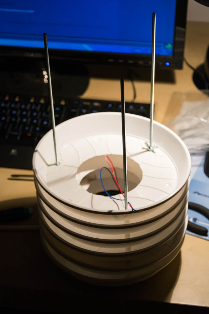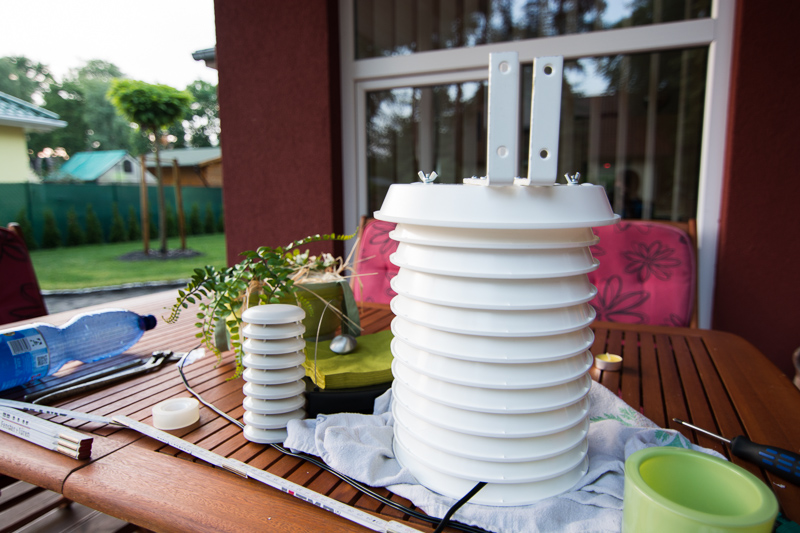 Da der mitgelieferte Strahlungsschutz der WH1080 relativ einfach konstruiert ist, kam es bei starker Sonneneinstrahlung zu relativ hohen Temperaturmessfehlern. Aus diesem Grund habe ich eine eigene, mit einem Ventilator ausgestatte Lamellenschutzhütte aus einfachen Blumentopfuntersetzern gebaut, welche den professionellen Lamellenhütten zumindest nachempfunden war. Die aus Kunststoff bestehenden Untersetzer wurden mit drei Gewindestangen und Abstandshülsen zusammengehalten, wobei die Funk- und Temperatureinheit am Boden der Hütte montiert wurde. Der Abstand der "Lamellen" war so gewählt, dass keine reflektierte Strahlung vom Boden in den Innenraum der Hütte eindringen und die Messwerte verfälschen konnte. Gleichzeitig sorgte die verhältnismäßig offene Bauweise für eine gute Durchlüftung mit Außenluft, sobald etwas Wind aufkam.